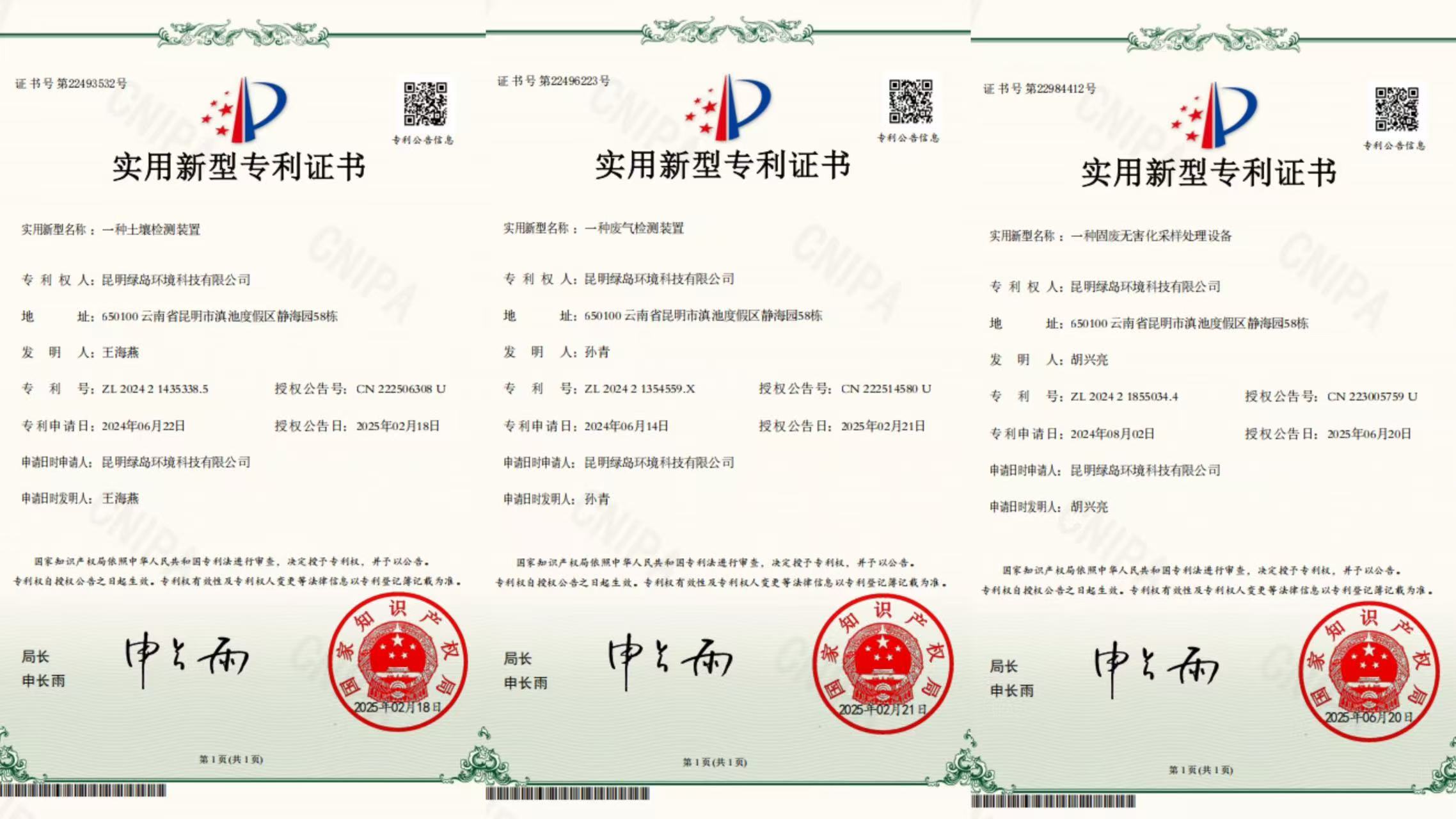 昆明綠島環(huán)境科技有限公司三項專利申請喜獲國家知識產權局授權